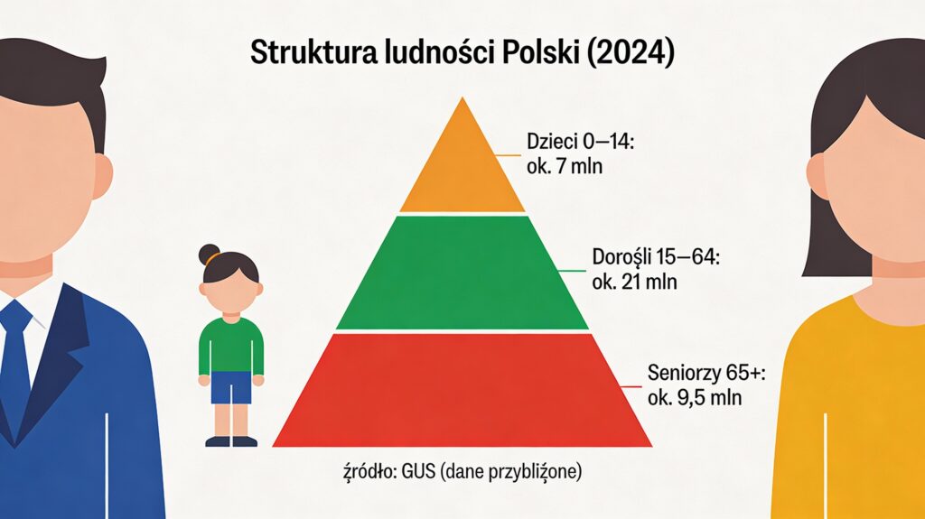 Dzieci 0–14 lat: z relacji GUS wynika, że na 100 dzieci przypada 141 osób 65+, co przy 37,5 mln ludności daje dzieci ok. 6,9–7,0 mln i seniorów 65+ ok. 9,1–9,2 mln.