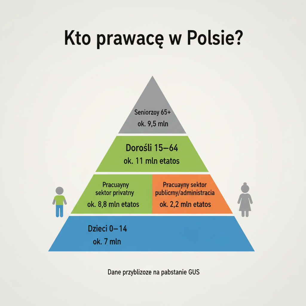 W Polsce około 37,5 mln mieszkańców dzieli się mniej więcej na 9,4 mln emerytów i rencistów, ok. 11 mln formalnie pracujących (etatów w gospodarce narodowej), a reszta to dzieci, młodzież i dorośli bierni zawodowo. Z grubsza wygląda to tak, że mniej niż połowa populacji realnie „zarabia”, a ok. 1/4 pobiera świadczenia emerytalno‑rentowe.